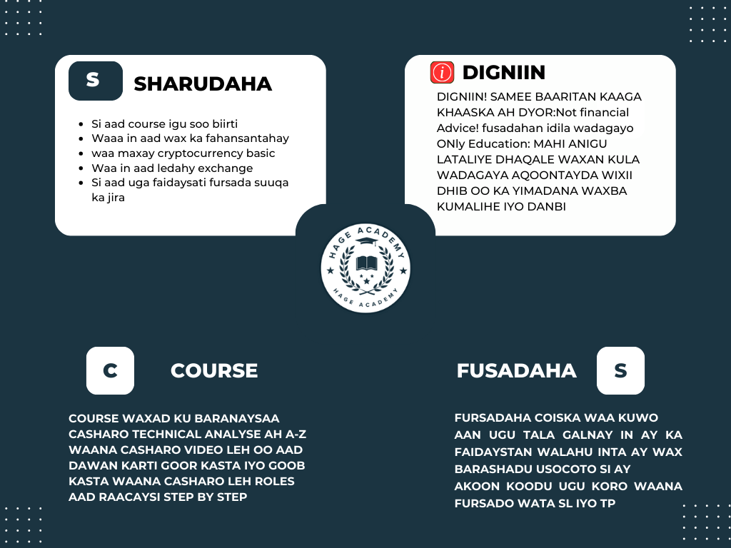 Asc abowe waad mahadsantahay sida aad noo garab istagtay waxan ka faiday course-dan waxyaalo aad ufara bdan waxay furtay idhaha hadana waxan ahay qof isku filan oo suuqa ka trade garan kara waad mahadsantahy inbadan walle kuma ilawi doono waligay. Ayaan Maxamed Cabdi TECHNICAL ANALYSIS